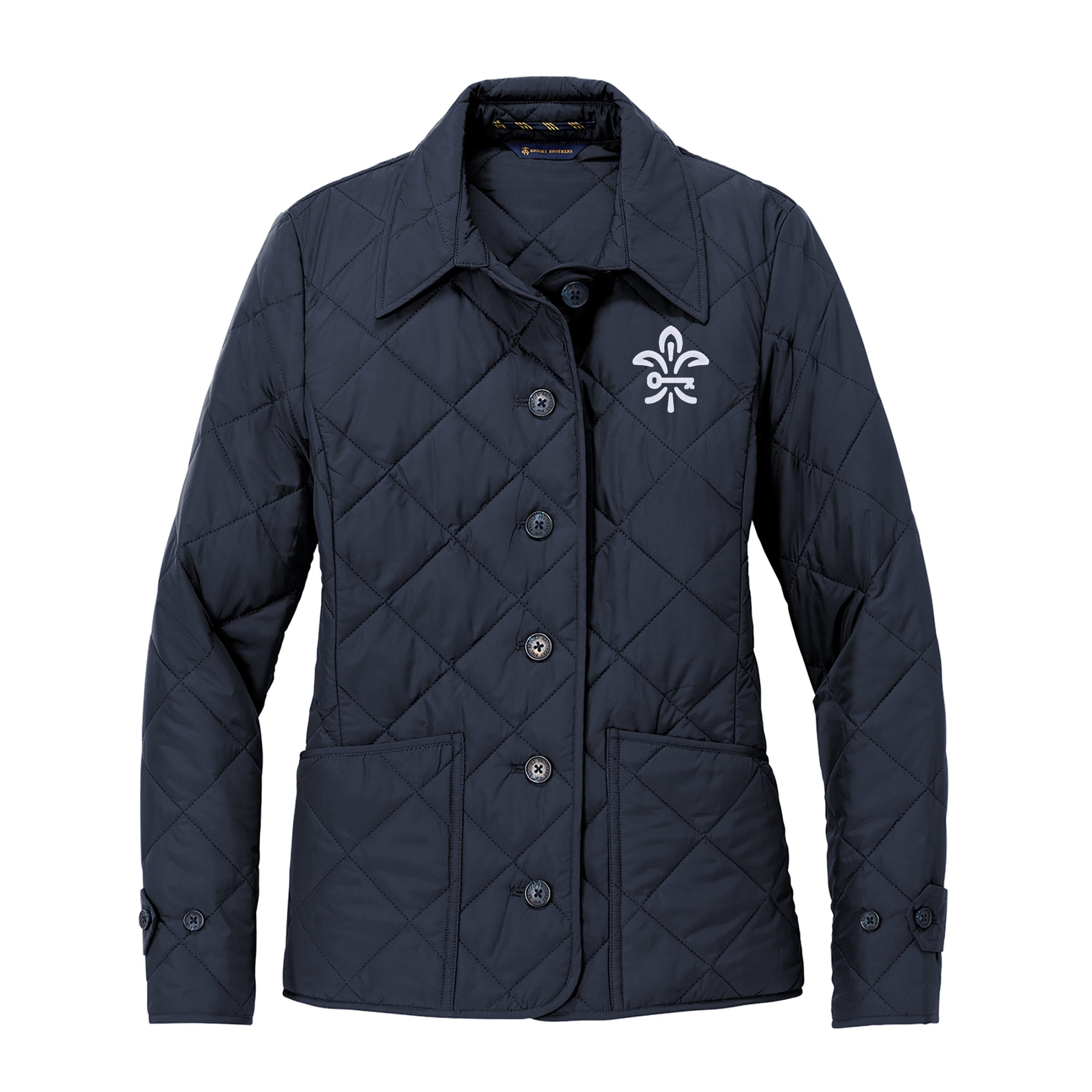 - Embroidered on Brooks Brothers Womens Quilted Jacket - 100% polyester shell and lining, polyfill insulation, Brooks Brothers tie-stripe hanging loop. Faux horn Brooks Brothers logo buttons. Front patch pockets. Adjustable tabs at cuff. Brooks Brothers tartan plaid-bound interior seams and lined front pockets