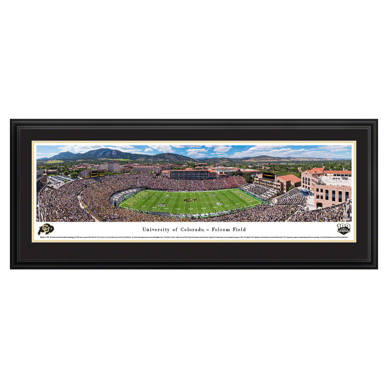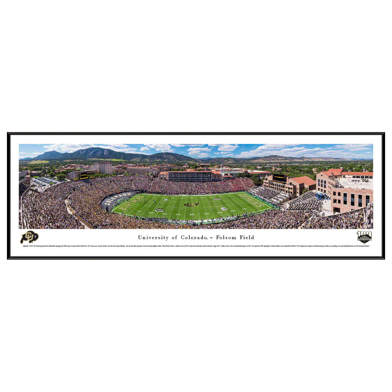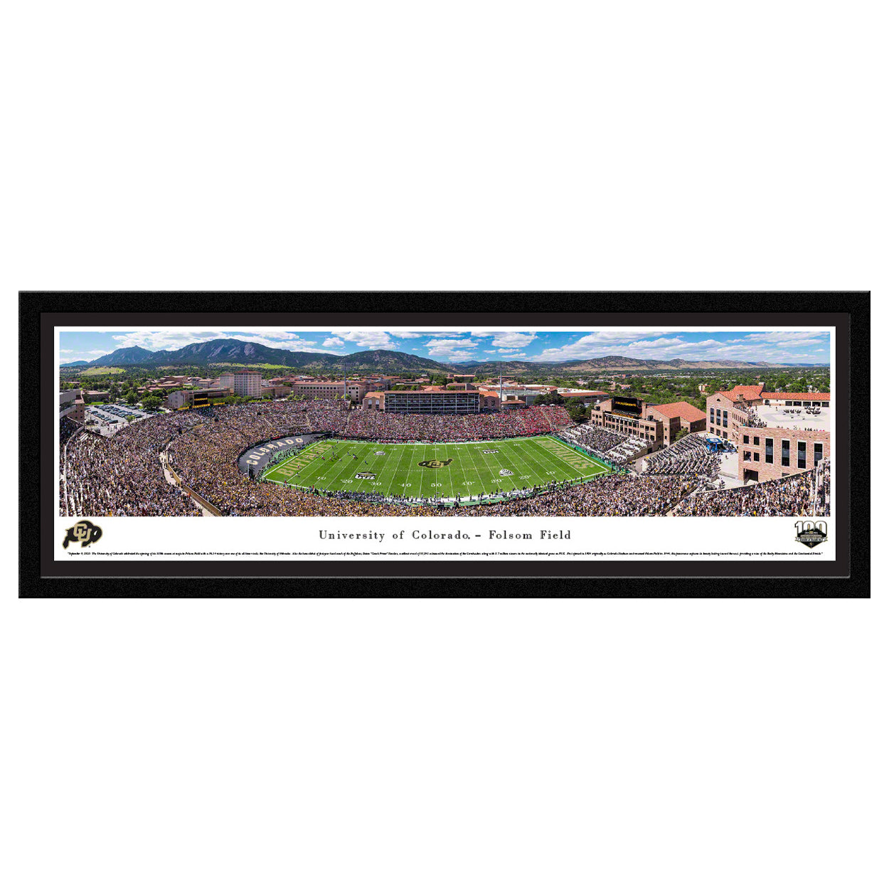 September 9, 2023: The University of Colorado celebrated the opening of its 100th season at majestic Folsom Field with a 36-14 victory over one of its all-time rivals, the University of Nebraska®. A sellout crowd of 53,241 plus 8.7 million viewers in the nationally televised game on FOX, witnessed Colorado’s domination over the Cornhuskers during the home debut of Buffaloes™ first-year head coach Deion "Coach Prime" Sanders. First opened in 1924 originally as Colorado Stadium, and renamed Folsom Field in 1944, this panorama captures its beauty looking toward the west, providing a view of the Rocky Mountains and the Continental Divide.